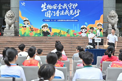 ◎ 四月十一日,在第十一個「全民國家安全教育日」來臨之際,廣州海關在廣州市開展「生物安全我守護,國門普法我先行」主題宣傳活動。圖為海關工作人員通過情景劇表演,為親子家庭科普生物安全知識。(中新社記者陳楚紅 攝)