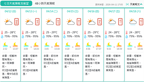 預測今日多雲,短暫時間有陽光。有一兩陣驟雨。吹三至四級偏南風,間中五級及有陣風。氣溫約為攝氏廿五至廿八度。相對濕度介乎百分之七十五至九十五之間。預測最高紫外線指數約為六,級別屬於高。◇