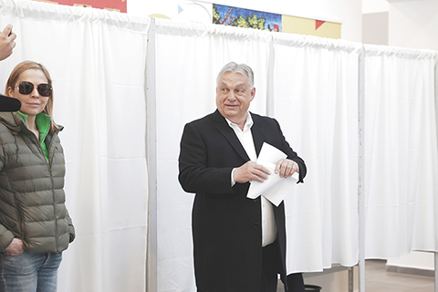 ◎ 四月十二日,在匈牙利首都布達佩斯,匈牙利總理歐爾班(右)在一處投票站參加投票。匈牙利國會選舉投票於當地時間當日早上六時(北京時間十二日十二時)正式開始。據匈牙利國家選舉辦公室數據,約八百一十萬名選民可進行投票,選出匈牙利新一屆國會議員。(新華社發 鮑洛格.拉斯洛 攝)