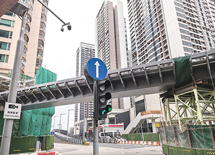 東北大馬路空中走廊建設,進入鋼結構吊裝施工。