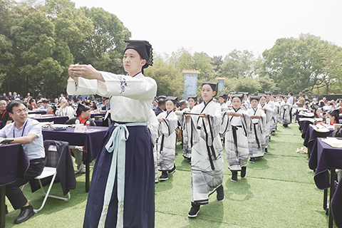 ◎ 四月十九日,青年獻聖筆、聖水。當日,第四十二屆蘭亭書法節在浙江紹興蘭亭開幕,吸引海內外書法界代表參與。東晉永和九年,大書法家王羲之與好友聚首蘭亭,酒後乘興寫就「天下第一行書」──《蘭亭集序》,此後「曲水流觴」成為千古佳話,蘭亭也成為聞名世界的書法聖地。(中新社記者 劉子琳 攝)