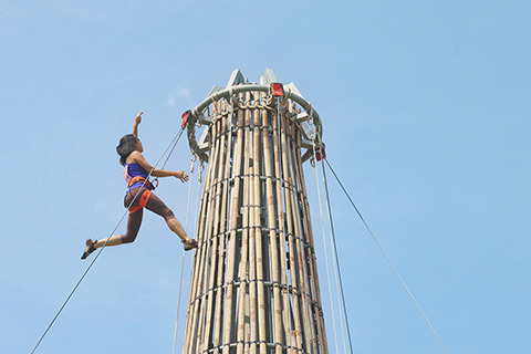 【港訊】八十七名參賽者昨日在長洲北帝廟遊樂場足球場參加選拔賽,爭取以最短時間攀登約十四米高的包山架。男子組有九名健兒入圍決賽,女子組則有三人晉身決賽,包括去年「包山王」郭嘉明,以及去年的「包山后」龔子珊。