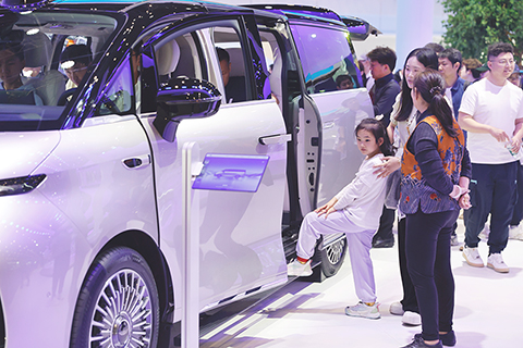 ◎ 四月二十六日,二零二六北京國際汽車展覽會迎來首個觀眾日。圖為小朋友準備試乘MPV。(中新社記者韓海丹 攝)
