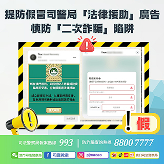 司法警察局發現,近日有騙徒在網上社交平台上冒用本局名義發佈虛假「法律援助申請」廣告,內容聲稱「澳門已為因詐騙而遭受損失的市民啟動補償計劃」。該等虛假帖文訛稱可協助被害人追回被騙資金,藉此誘使市民點擊相關連結,並填報姓名及聯絡電話等個人資料。