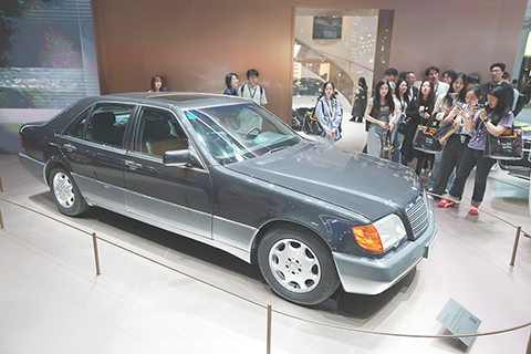 ◎ 四月二十七日,二零二六北京國際汽車展覽會迎來第二個觀眾日。圖為奔馳展出的W140款S級轎車吸引車迷參觀。(中新社記者 富田 攝)