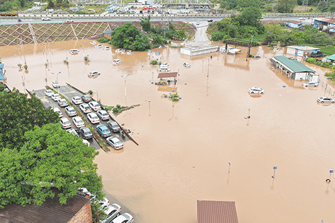 ◎ 四月二十七日,廣西欽州遭遇特大暴雨襲擊,迅猛的雨勢導致欽州市嚴重內澇,城區大面積積水,城市交通、市民出行受影響。(無人機照片)(中新社發 陸敏 攝)