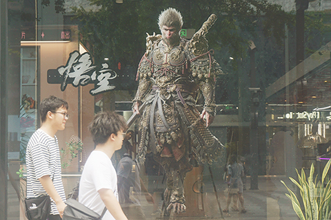 《黑神話.悟空》現象級破圈 ◎ 二零二四年八月二十日,《黑神話.悟空》正式登錄PC70、PS5平台,標註中國遊戲產業的一大突破。從古典文學到國產3A大作,《西遊記》的文化張力跨越千年。圖為八月二十日,在杭州街頭,遊戲愛好者從遊戲《黑神話:悟空》中悟空的形象海報前走過。當日,中國首款3A遊戲《黑神話:悟空》正式上線,吸引不少遊戲玩家體驗。(新華社發龍巍 攝)