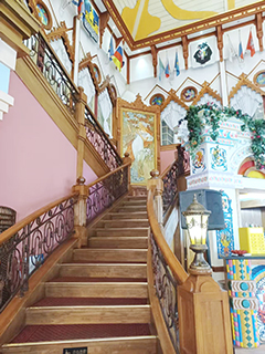 金環西餐廳不止是享受俄羅斯美食,餐廳環境也是佈置得美輪美奐的,餐廳大廳有兩層高的彩繪大廳,配上水晶吊燈,在俄羅斯巨幅油畫《春天仙子》,營造出恢弘典雅的氛圍。大廳有座很有氣勢的樓梯,有佔地廣闊的迴旋樓梯,樓梯分成左右兩部分,蜿蜒盤旋的層層疊錯落有致,柔美的水晶吊燈映照着樓梯優雅的線條,非常雅致亮麗。