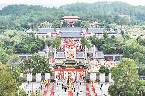 ◎ 十月十六日,第三十一屆客家文化節在「客家祖地」福建省寧化縣石壁鎮舉行,海內外近九十個客屬社團代表與社會各界人士近三千八百人齊聚一堂。石壁是客家民系孕育生成的重要搖籃,石壁客家公祠更是全球客家人的「總家廟」。本屆客家文化節以「振揚客家精神,賡續祖地榮光」為主題。自一九九五年起,寧化已連續舉辦三十一屆世界性客家文化節,吸引全球二百多萬各界人士來石壁尋根謁祖、觀光交流。圖為祭祀大典在石壁客家公祠進行。(無人機照片)(中新社發 黃尉峰攝)