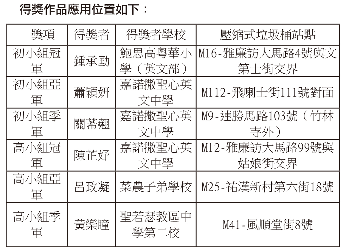【特訊】壓縮式垃圾桶飾面設計比賽早前已順利舉行,市政署將初小組及高小組的冠、亞、季軍共六幅作品製成飾面膠貼,裱貼於街道上的壓縮式垃圾桶桶身,為壓縮桶換上新「衣裳」,改善垃圾收集設施在大眾心中的刻板印象,亦為城市增添色彩。同時,藉呈現學童的創意設計,鼓勵公眾愛護公共設施、關注環境衛生,共建美潔城市。