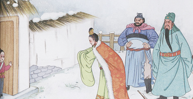 劉備聽說隱居在隆中的諸葛亮很有才能,就帶著關羽和張飛去拜訪他。第一次去,諸葛亮不在家。第二次去,諸葛亮也不在家。第三次去,諸葛亮正在午睡,劉備就站在台階下安靜地等待。
