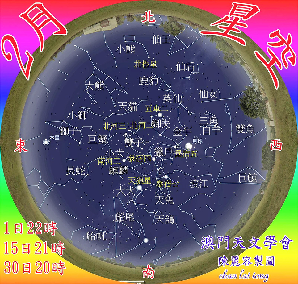 天王星留時間為2月4日12點。海王星合土星(北0.91°)時間為2月16日11點。天王星東方照(亮度5.7等,視直徑3.6")時間為2月16日13點。水星東大距(亮度-0.5等,距角18.1°)時間為2月20日1點。水星留時間為2月26日0點。水星合金星(北4.70°)時間為2月27日7點。◇(建燁)