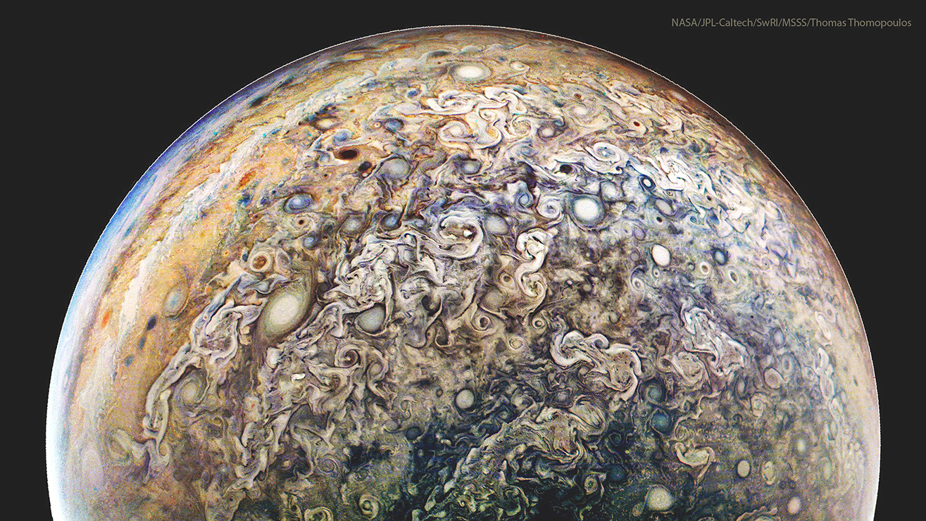 此外,朱諾號的電波測量顯示,木星的大氣層在上層雲層之下的結構甚至延伸到數百公里深。木星新發現的複雜性在南半球的雲層中也顯而易見,正如上個月拍攝的紋理和色彩增強的特色圖像所示。在那裡,赤道附近佔主導地位的行星環繞區域和帶狀結構逐漸衰退成由大陸大小的風暴漩渦構成的複雜霧氣。朱諾號繼續在其環繞木星的橢圓軌道上運行,每個月都會掠過這顆巨大的行星,每次都會探索略有不同的區域。◇