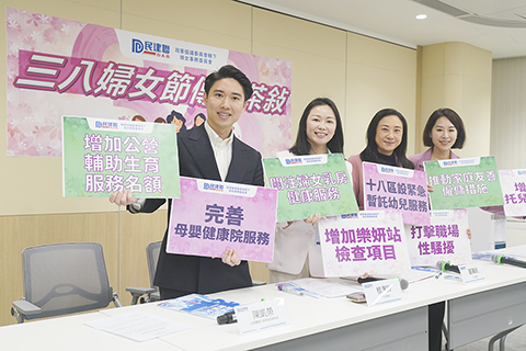◎ 三月四日,「三八」婦女節來臨之際,香港民建聯政策倡議委員會轄下婦女事務委員會委員主席葛珮帆(右二)、立法會議員植潔鈴(右三)、郭芙蓉(右一)舉行傳媒茶敍,就近年來有關婦女焦點議題與傳媒交流。(香港中通社記者 陳奕啟 攝)