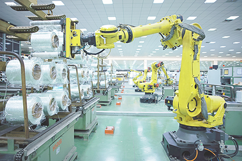 ◎ 4月14日,智能生產線上,機械臂進行搬運作業。近年來,建材行業加速從「製造」向「智造」轉型,玻璃纖維作為風電、新能源汽車、5G通信等領域的關鍵材料,成為科技升級突破的重要組成部份。在浙江桐鄉,中國巨石的智能製造基地探索「數字工廠+AI」,推動生產工藝、智能裝備與決策管理融合,實現自身效率提升,促進產業鏈上下游協同升級。(中新社記者 孫楊洋 攝)