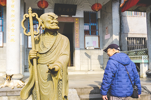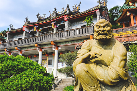 台灣新北市汐止區拱北殿,是著名的百年古剎,建於清光緒廿七年(西元一九0一年),俗稱汐止仙公廟,初為一座木造建築,後拆除重建,主祀道教全真派祖師呂純陽真人,也就是八仙當中的「孚佑帝君」呂洞賓。廟宇內環境清幽,沿途山林靜謐草木扶疏,楓樹將山頭染紅之際更是美不勝收,而廟前雙拱橋更是造型優美、古樸雅致,有眾星拱北辰之意。圖為正殿前石雕佛像,法相莊嚴慈祥,建築更展現廟宇之美,散發宗教文化的莊嚴氛圍。(香港中通社圖片)