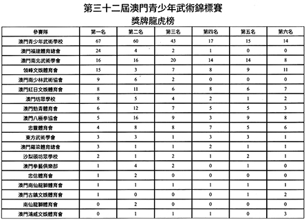 第三十二屆澳門青少年武術錦標賽獎牌龍虎榜