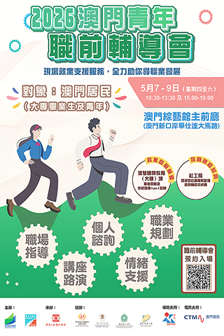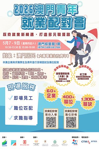 【特訊】為協助澳門青年順利開展職業生涯及投入就業巿場,由教育及青年發展局和勞工事務局主辦、澳門工會聯合總會承辦的二0二六「澳門青年就業配對會」(下稱配對會)及「澳門青年職前輔導會」(下稱職輔會),將於五月七日至九日一連三日於澳門綜藝館舉行。配對會及職輔會兩項活動由今(二十一)日起可於網上預約及報名。