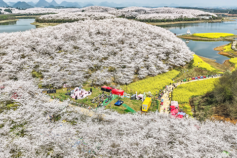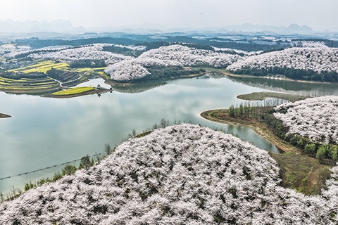 貴州:櫻花似海 春滿大地 2026-04-25 03:31:00 近日,隨著氣溫回升,貴州省貴安新區櫻花園內的二點四萬畝櫻花迎來盛花期。如雲似霞的櫻花和山川、湖泊、民居構成一幅幅美麗的春日畫卷,吸引眾多遊客前來觀光遊玩。(新華社記者 陶亮 攝)